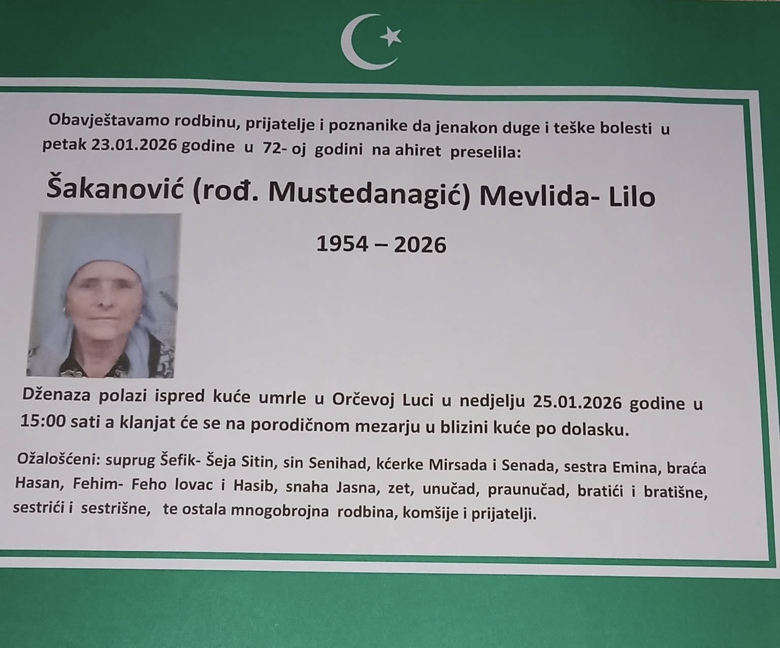 Dženaza polazi ispred kuće umrle u Orčevoj Luci u nedjelju 25.01.2026. godine u 15:00 sati, a klanjat će se na porodičnom mezarju u blizini kuće po dolasku.