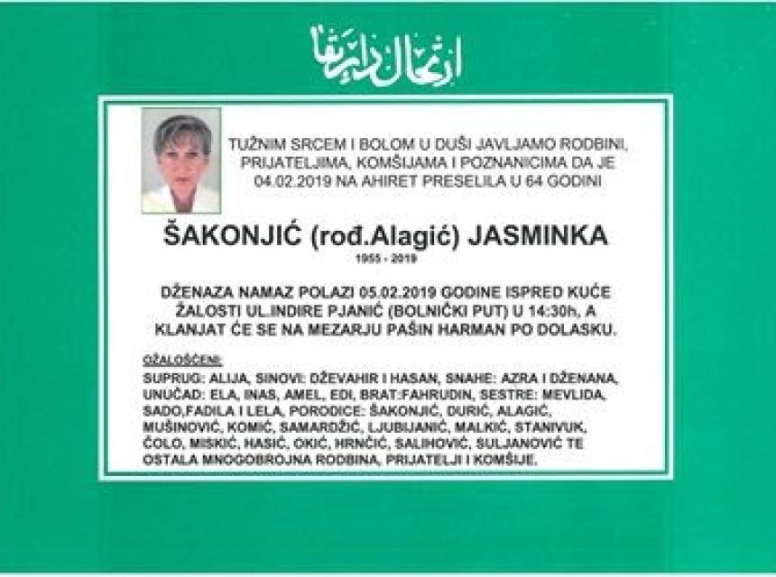 Tužnim srcem i bolom u duši Vam javljamo da je 04.02.2019. godine u 64.-oj godini života na Ahiret preselila Šakonjić (rođ. Alagić) Jasminka.