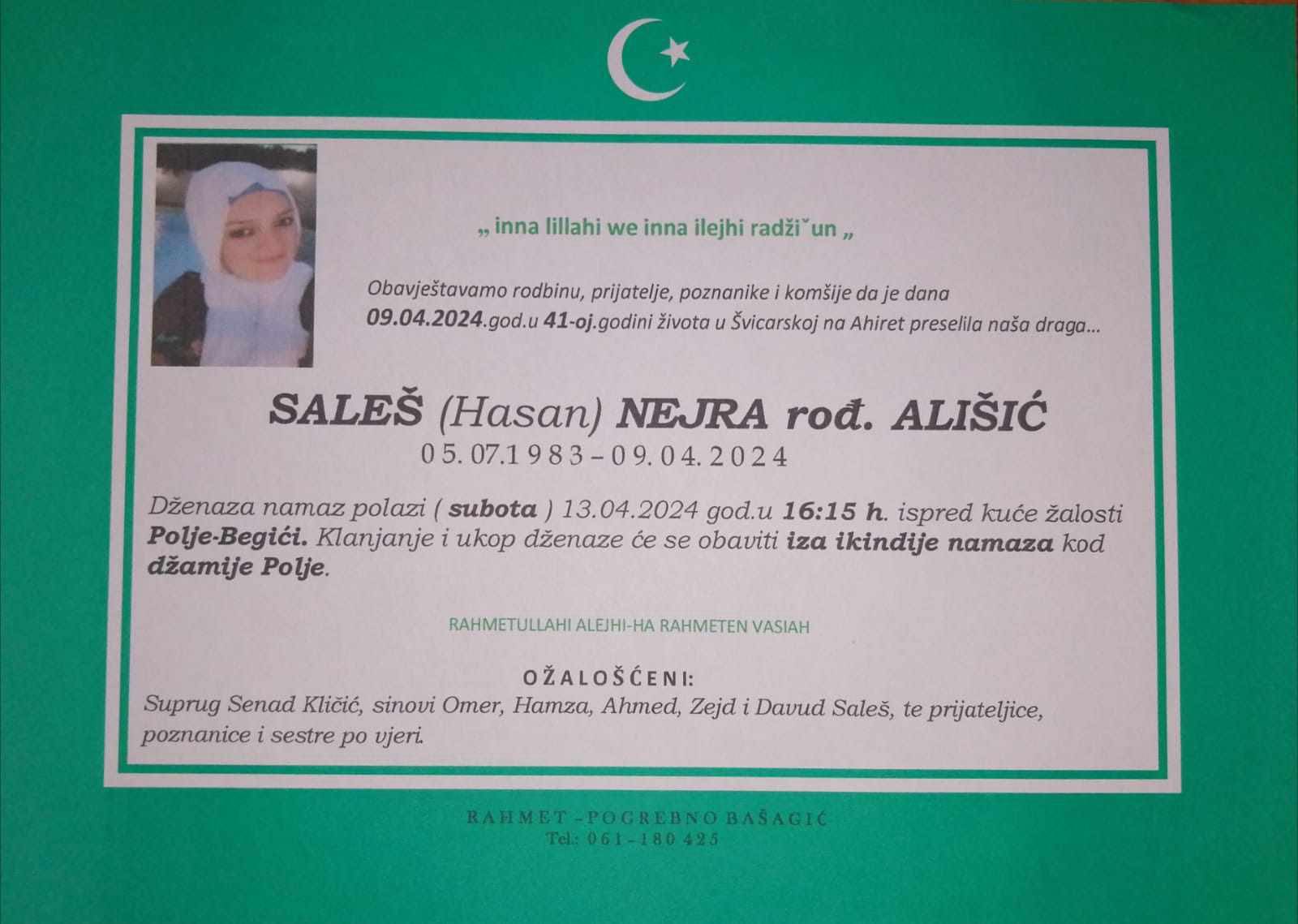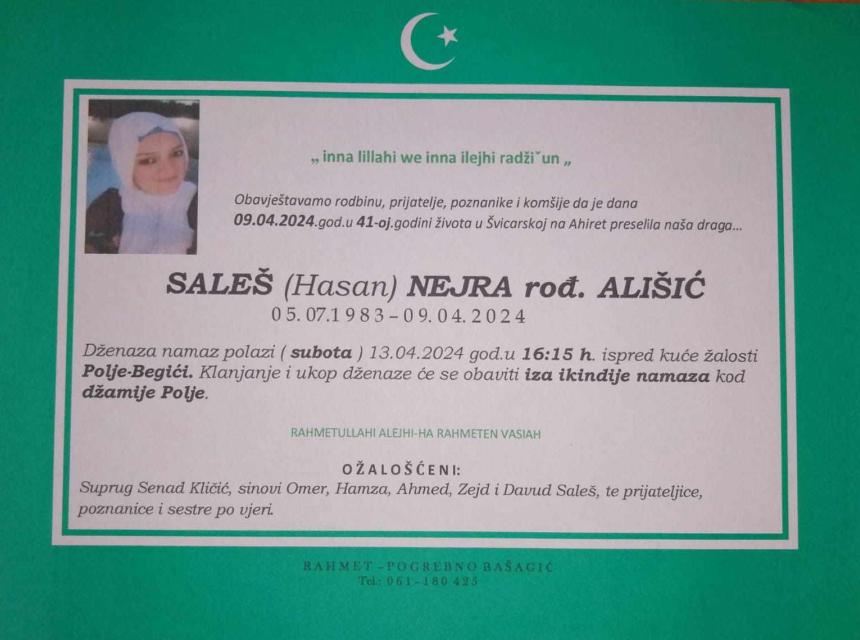 Obajestavamo rodbinu, prijatelje, poznanike i komsije da je dana 09.04.2024.god. 41-oj.godini Zivota na Ahiret preselila nasa draga Saleš (Hasan) Nejra rođ. Ališić