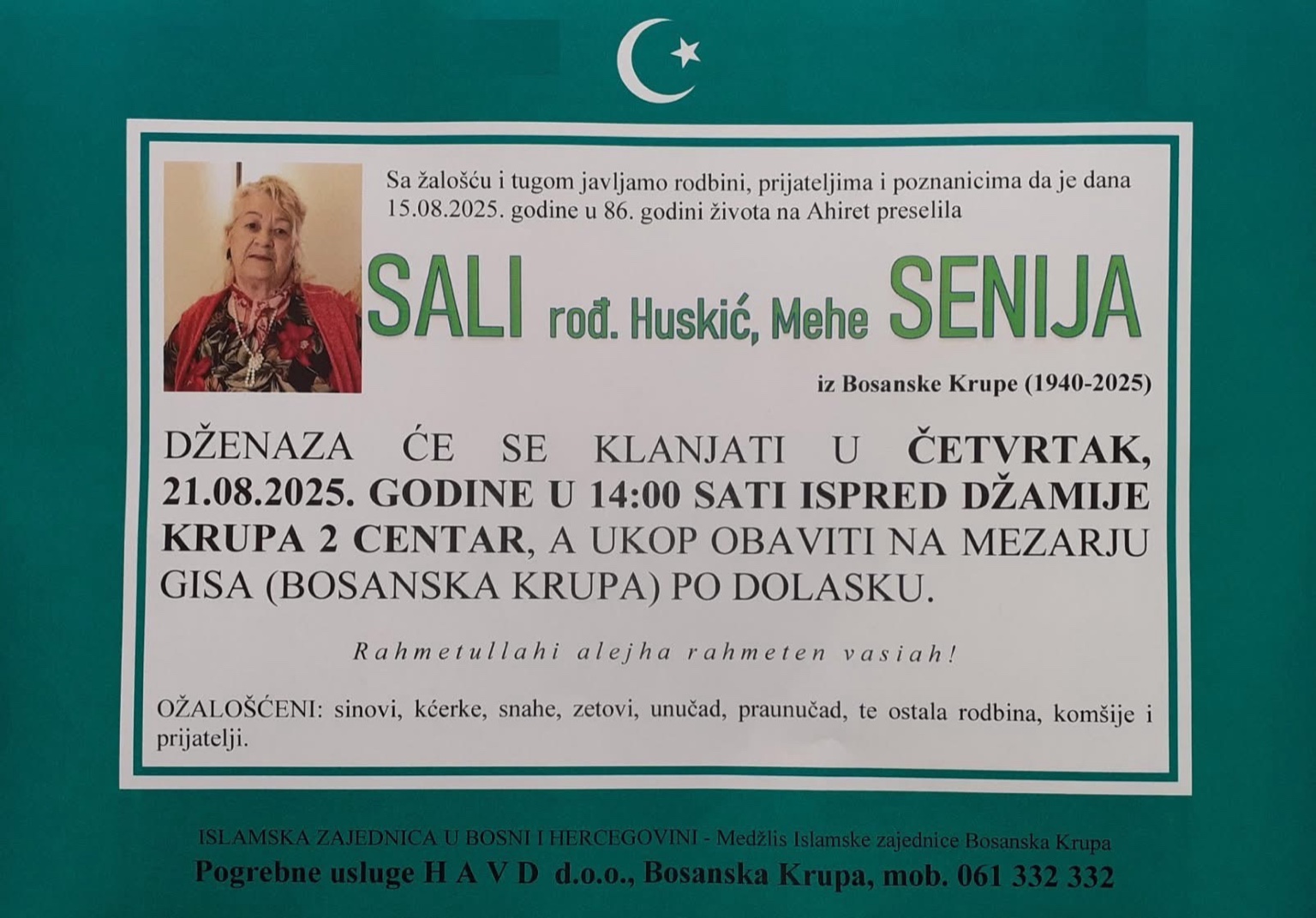 Dženaza će se klanjati u četvrtak, 21.08.2025. godine u 14:00 sati ispred džamije Krupa 2 Centar, a ukop obaviti na mezarju Gisa (Bosanska Krupa) po dolasku.