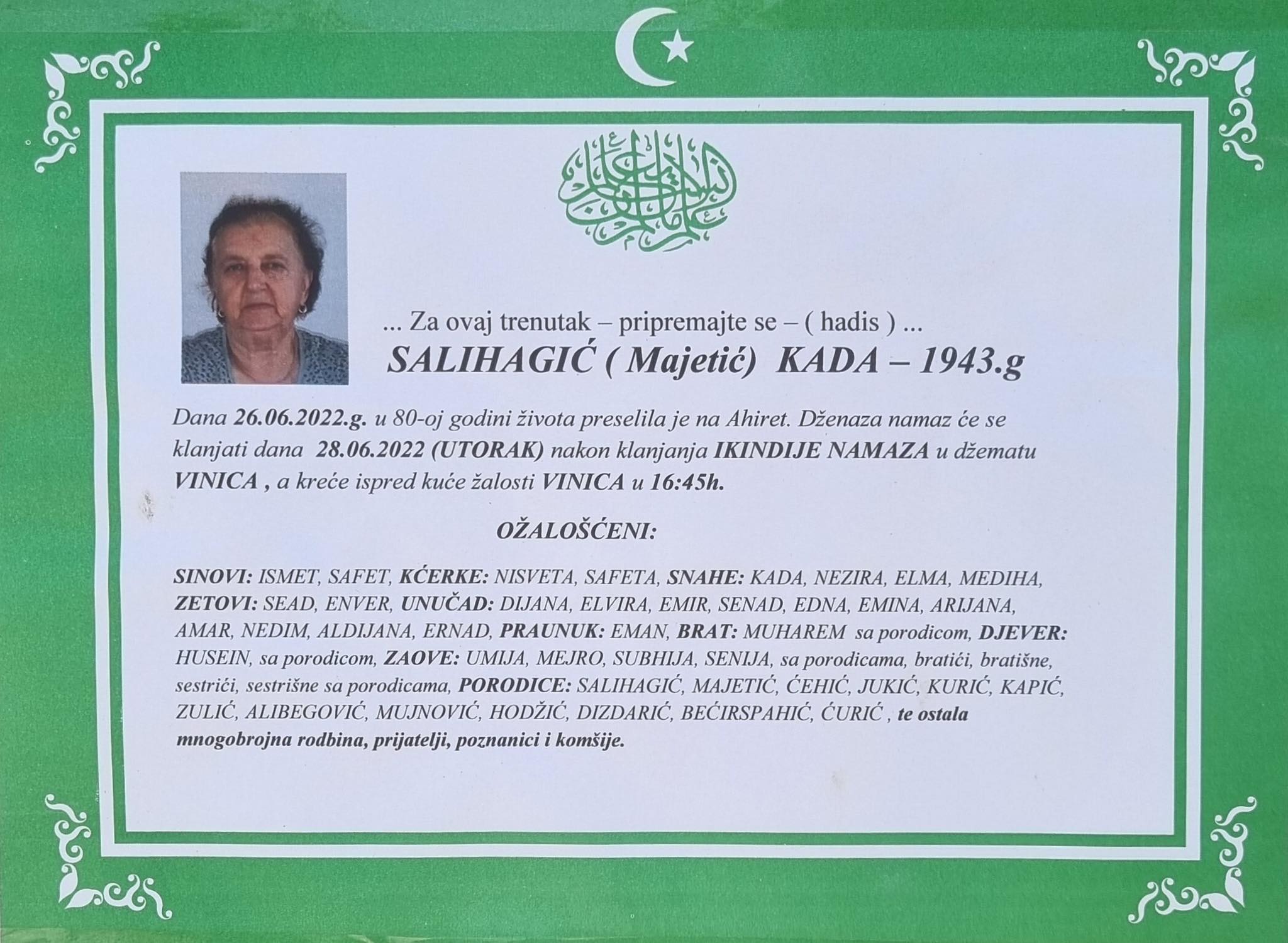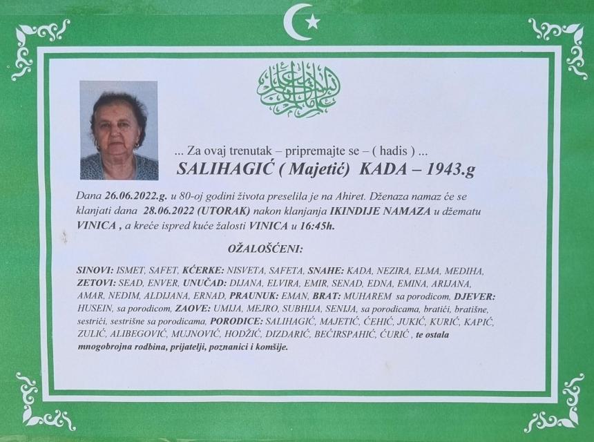 Tužnim srcem i bolom u duši javljamo rodbini, prijateljima i komšijama da je dana 26.062022.godine, u 80. godini života na Ahiret preselila Salihagić (Majetić) Kada.