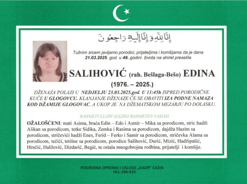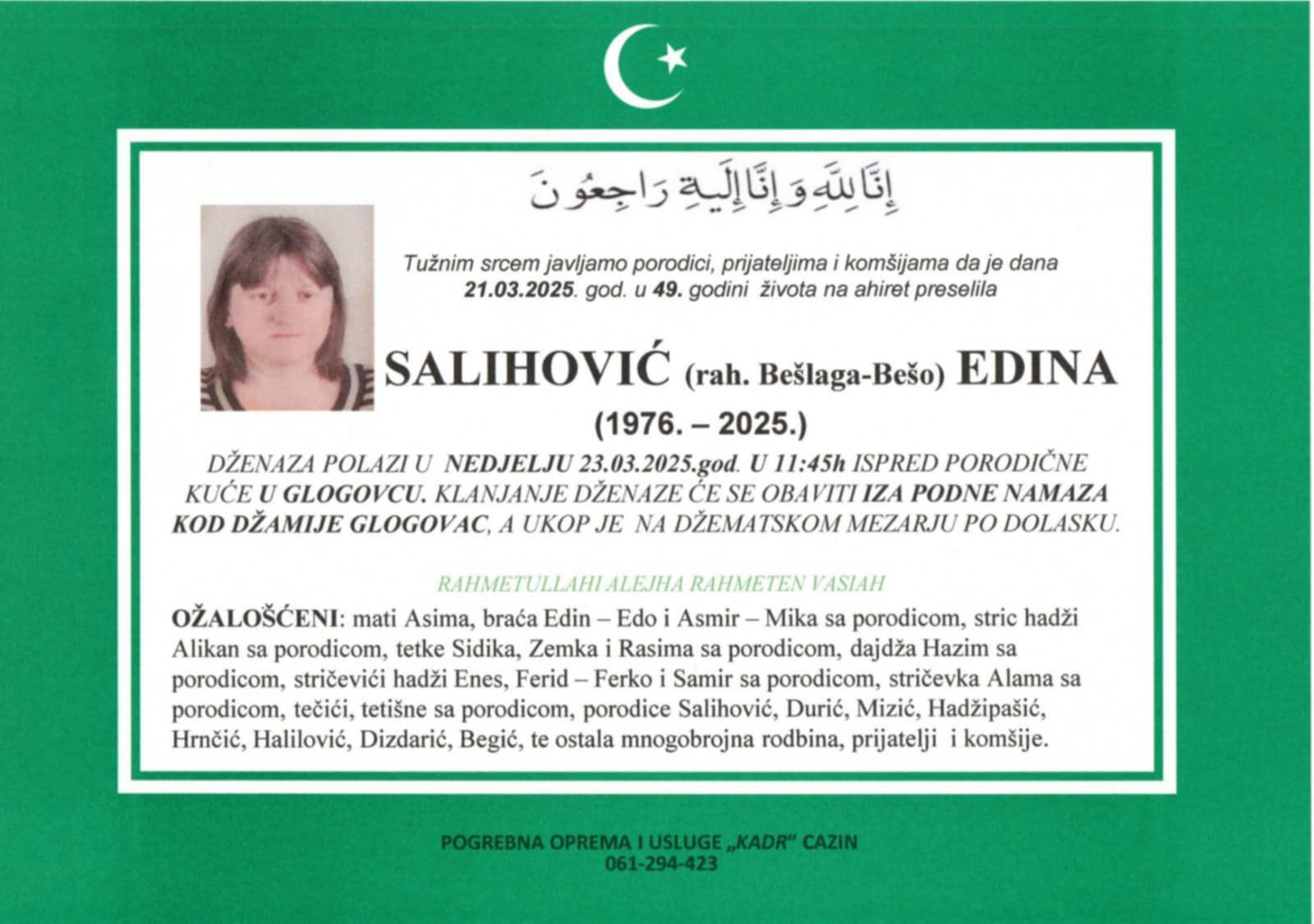 Tužna srca i s bolom u dušu obavlještavamo da je preselila Salihović (rah. Bešlaga – Bešo) Edina na ahiret 21.03.2025. god. u 49. godini života.