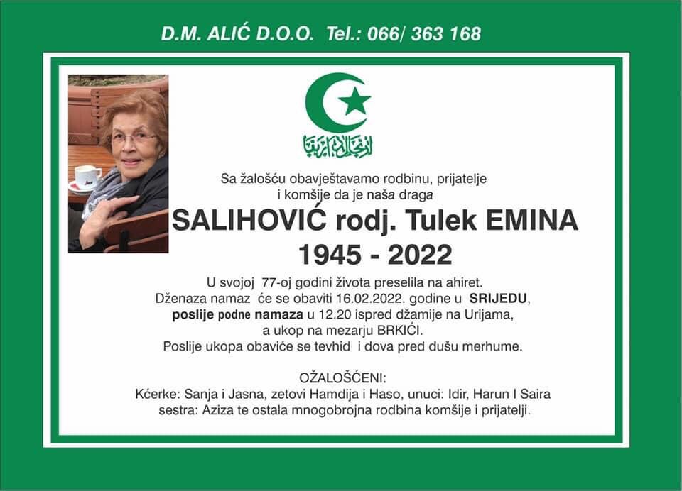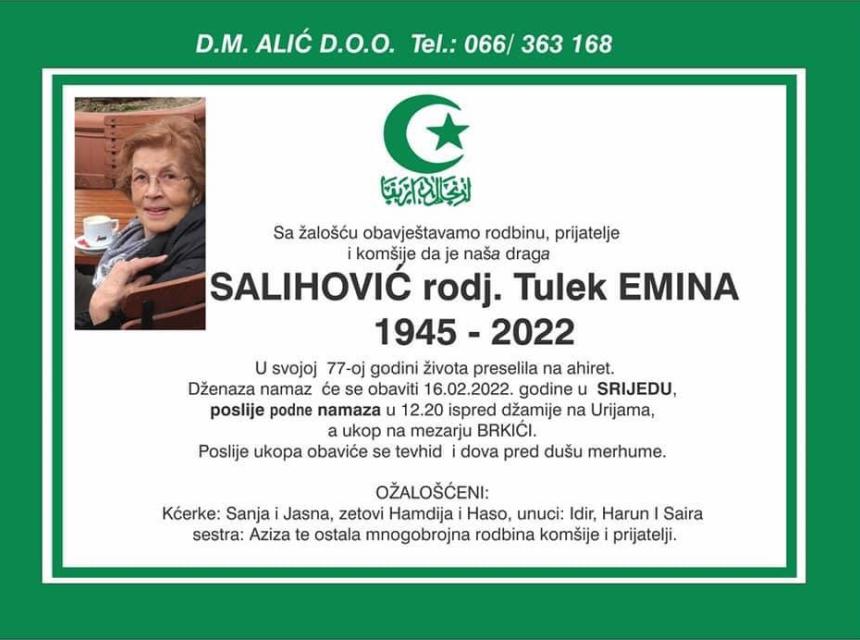 Tužnog srca i s bolom u duši obavještavamo rodbinu, komšije i prijatelje da je naša draga Salihović rođ. Tulek Emina, u svojoj 77-oj godini života, preselila na Ahiret.