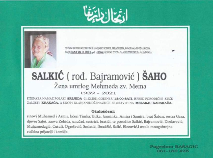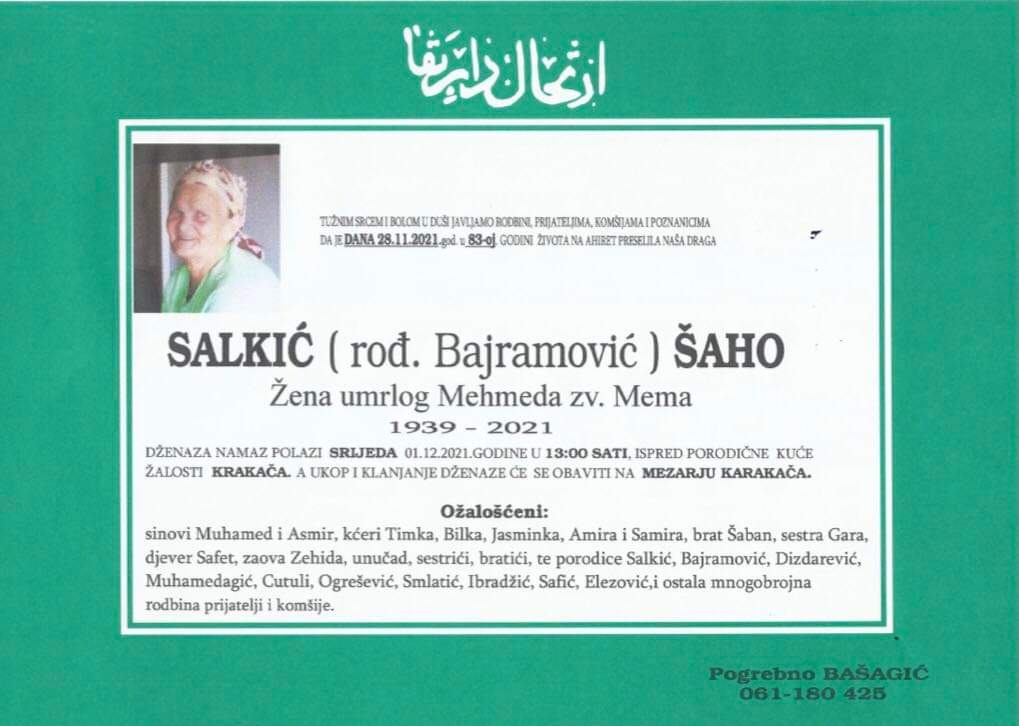 Tužnog srca i s bolom u duši obavještavamo rodbinu, komšije i prijatelje da je naša draga Salkić (rođ. Bajramović) Šaho dana 28.11.2021. u 83. godini života preselila na ahiret.