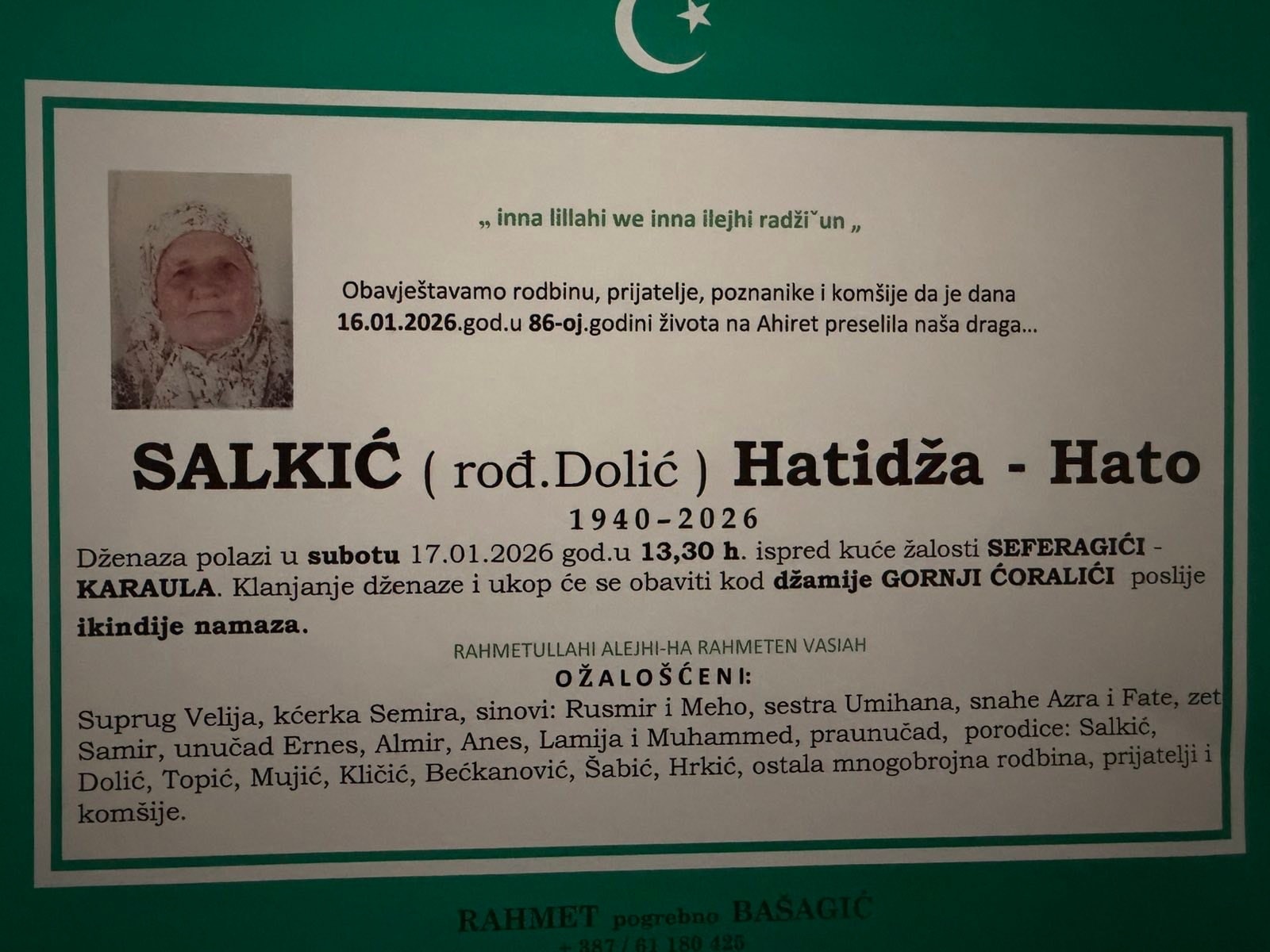 Obavještavamo rodbinu, prijatelje, poznanike i komšije da je dana 16.01.2026.god.u 86-oj.godini života na Ahiret preselila naša draga SALKIĆ ( rođ.Dolić) Hatidža - Hato.
