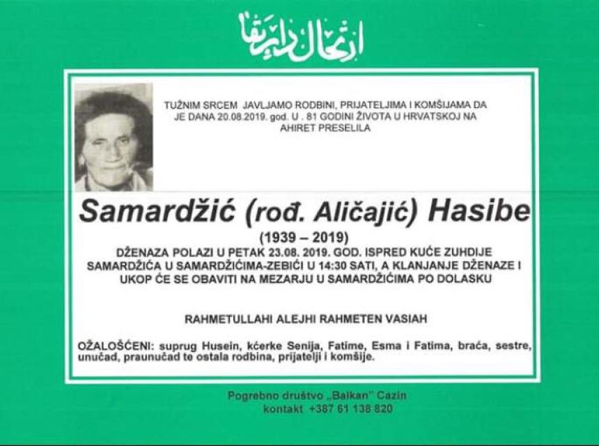 Tužnim srcem javljamo rodbini, prijateljima i komšijama da je dana 20.08.2019.god. u 81 godini života u Hrvatskoj na ahiret preselila Samardžić (rođ. Aličajić) Hasibe.