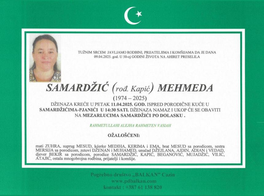 Tužnim srcem javljamo rodbini, prijateljima i komšijama da je dana 09.04.2025. god. u 50-oj godini života na ahiret preselila SAMARDŽIĆ (rođ. Kapić) MEHMEDA.