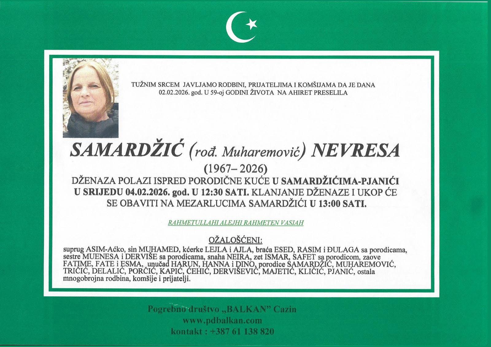 Dženaza polazi ispred porodične kuće u Samardžićima – Pjanići u srijedu, 04.02.2026. godine, u 12:30 sati.