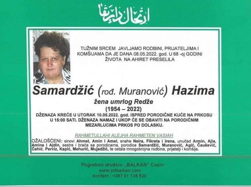 Tužnog srca i s bolom u duši obavještavamo rodbinu, komšije i prijatelje da je naša draga Samardžić (rođ. Muranović) Hazima u 68. godini života preselila na Ahiret.