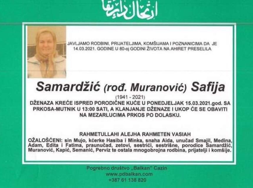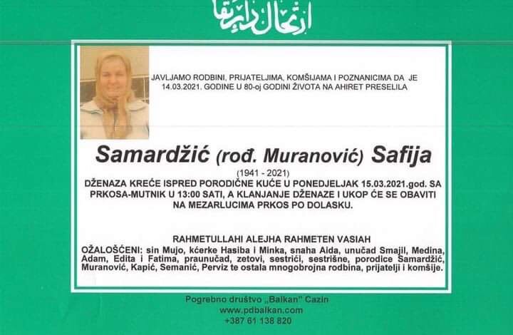 Tužnog srca i s bolom u duši obavještavamo rodbinu, komšije i prijatelje da je naša draga Samardžić (rođ. Muranović) Safija, dana 14.03.2021 godine, u 80-oj godini života, preselila na Ahiret.