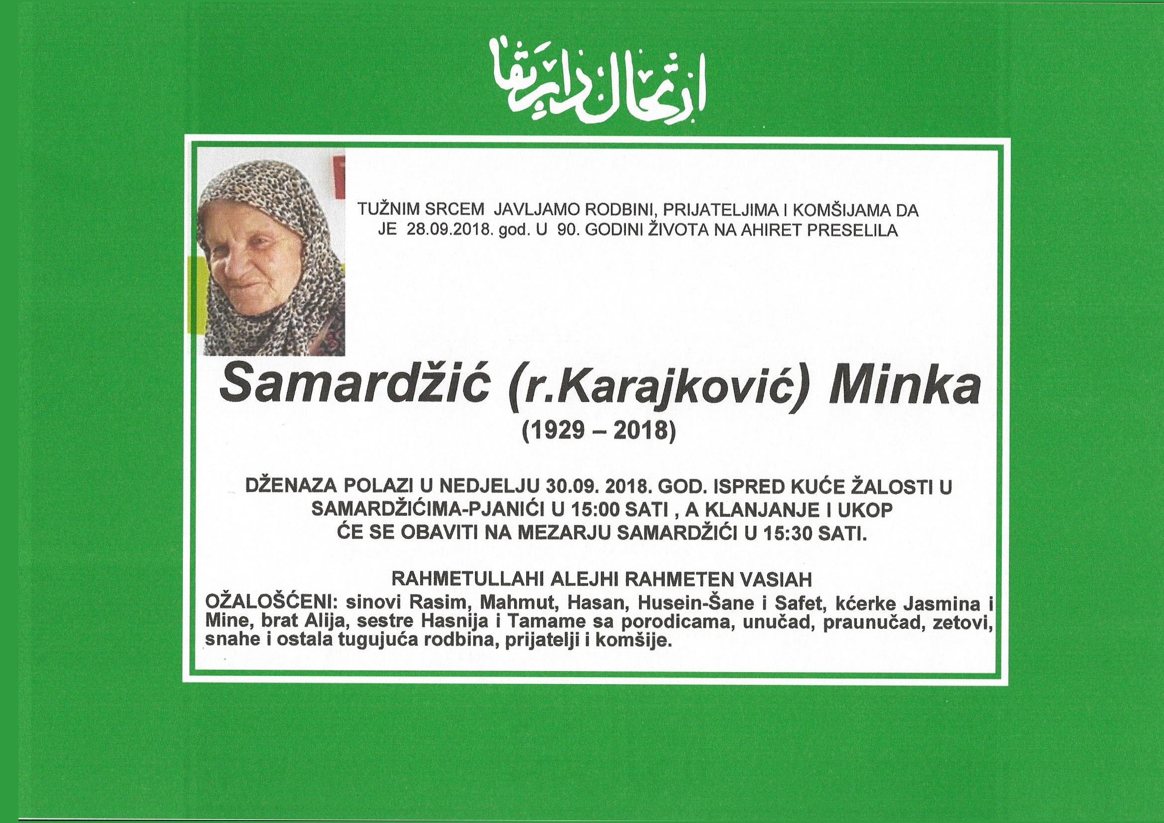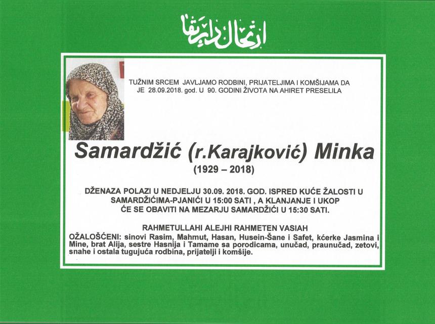 Tužnim srcem i bolom u duši javljamo rodbini, prijateljima, komšijama i poznanicima da je dana 28.09.2018. godine u 90-oj godini života na Ahiret preselila Samardžić (rođ.Karajković) Minka.