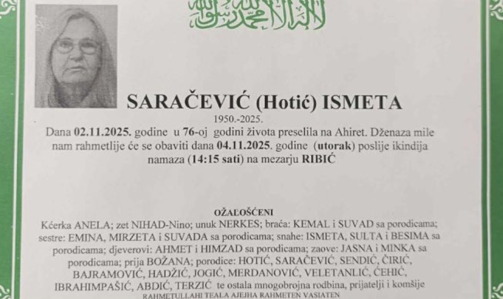 Dženaza mile nam rahmetlije će se obaviti dana 04.11.2025. godine (utorak) poslije ikindija namaza (14:15 sati) na mezarju Ribić.