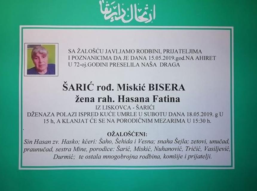 Tužnim srcem i bolom u duši javljamo rodbini, prijateljima, komšijama i poznanicima da je dana 15.05.2019. god. u 72-oj. godini života preselila na Ahiret naša draga Šarić (rođ. Miskić) Bisera.