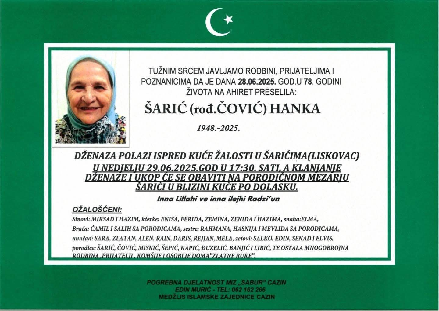 Tužnim srcem i bolom u duši javljamo rodbini, prijateljima i komšijama da je naša draga Šarić (rođ. Čović) Hanka, dana 28.06.2025. godine u 78-oj godini života, preselila na Ahiret.