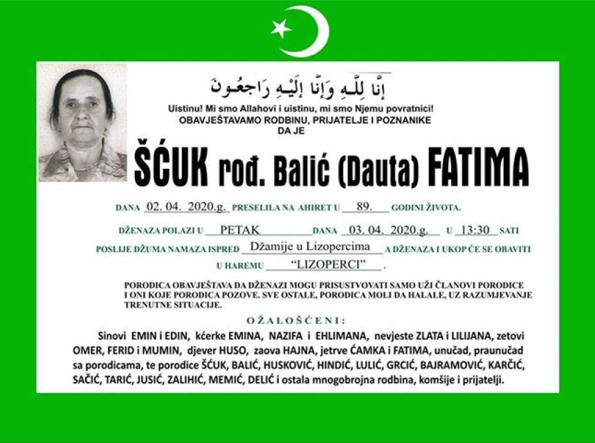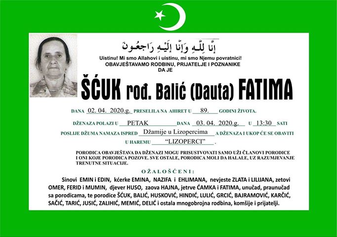 Tužnim srcem i bolom u duši javljamo rodbini i prijateljima da je naša draga i nikad prežaljena Šćuk rođ. Balić (Dauta) Fatima dana 02.04.2020. godine u 89-toj godini života preselila na Ahiret. Dženaza namaz će se obaviti u petak 03.04.2020. godine u 13:30 sati poslije Džuma namaza ispred Džamije u Lizopercima, a Dženaza i ukop će se obaviti u Haremu "LIZOPERCI".