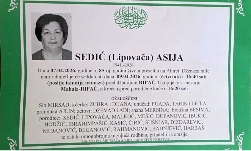 Dženaza mile nam rahmetlije će se klanjati dana 09.04.2026. godine (četvrtak) u 16:40 sati (poslije ikindija namaza) pred džamijom RIPAČ.