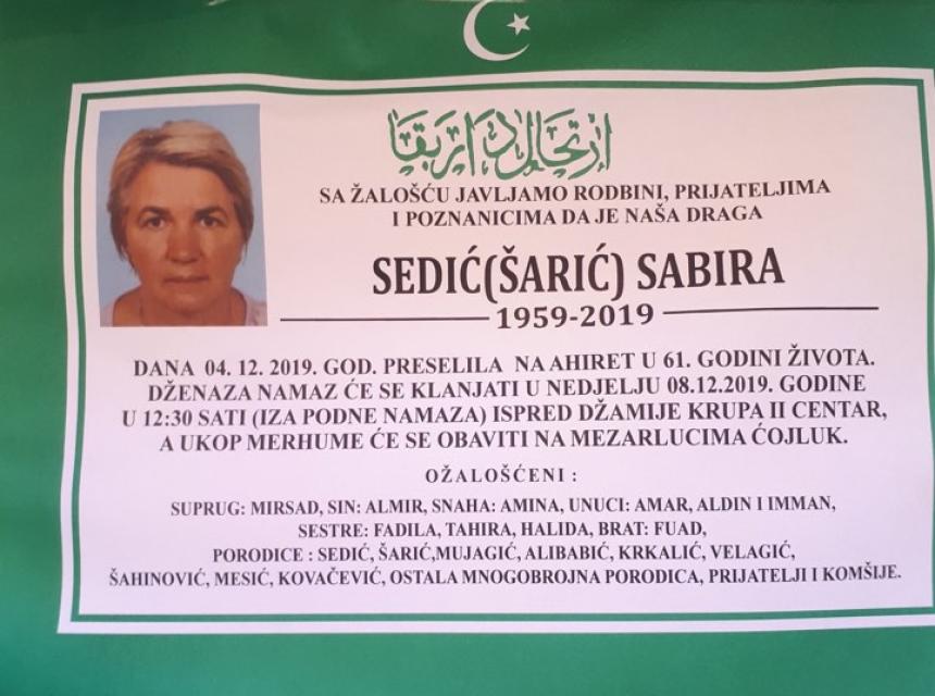 Sa tužnim srcem i bolom u duši, javljamo rodbini i prijateljima da je naša draga Sedić (Šarić) Sabira, dana 04.12.2019. godine u 61-oj godini života preselila na Ahiret.