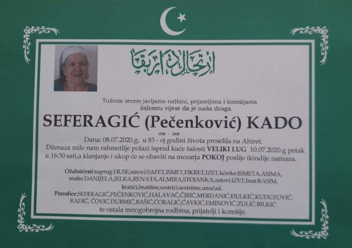 Tužnog srca i s bolom u duši obavještavamo rodbinu, komšije i prijatelje da je naša draga Seferagić (Pečenković) Kado, dana 08.07.2020. godine, u 83. godini života preselila na Ahiret.