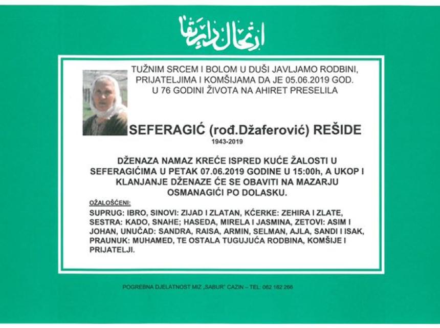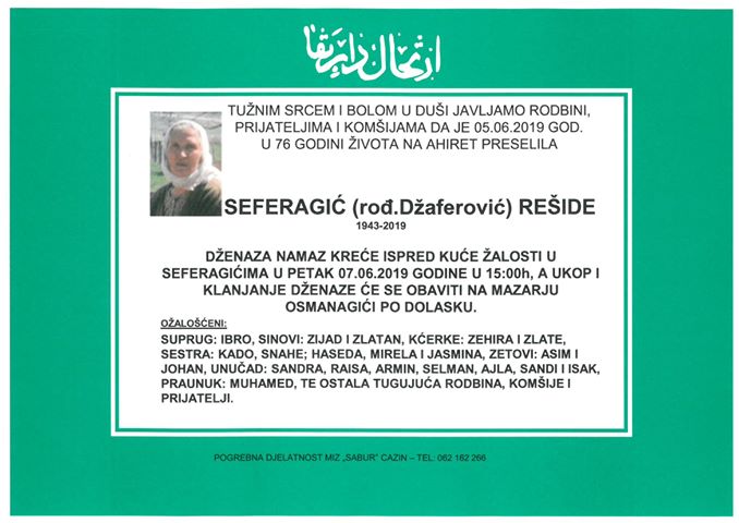 Tužnim srcem i bolom u duši javljamo rodbini, prijateljima i komšijama da je 05.06.2019 god. u 76 godini života na Ahiret preselila Seferagić (rođ. Džaferović) Rešide.