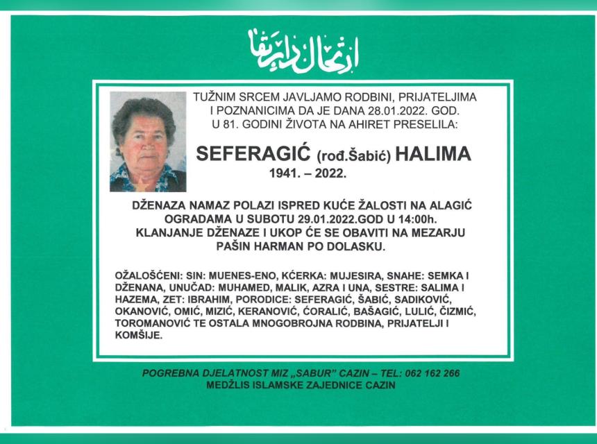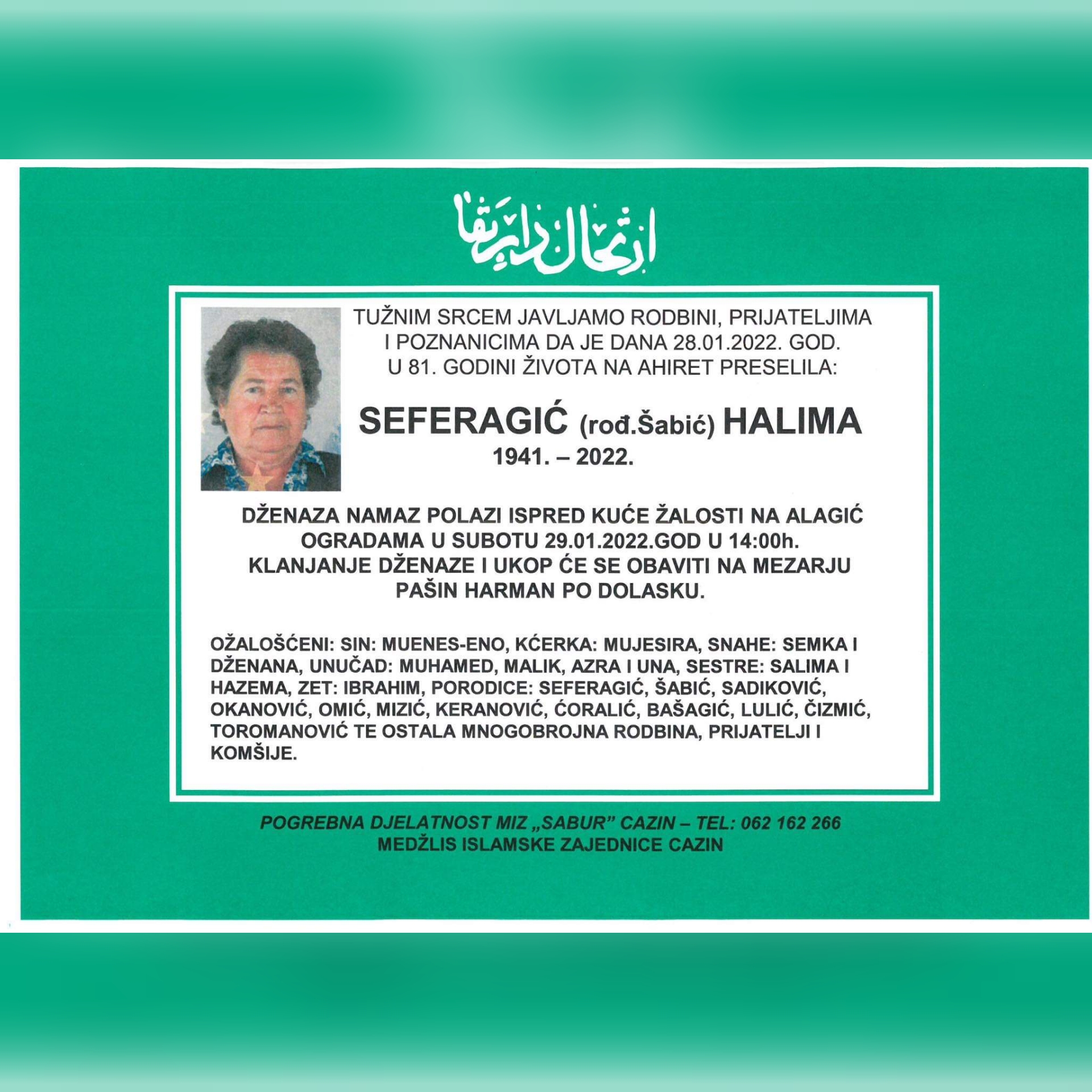 Tužnog srca i s bolom u duši obavještavamo rodbinu, komšije i prijatelje da je naša draga Seferagić (rođ. Šabić) Halima 28.1.2022. u 81. godini života preselila na ahiret.