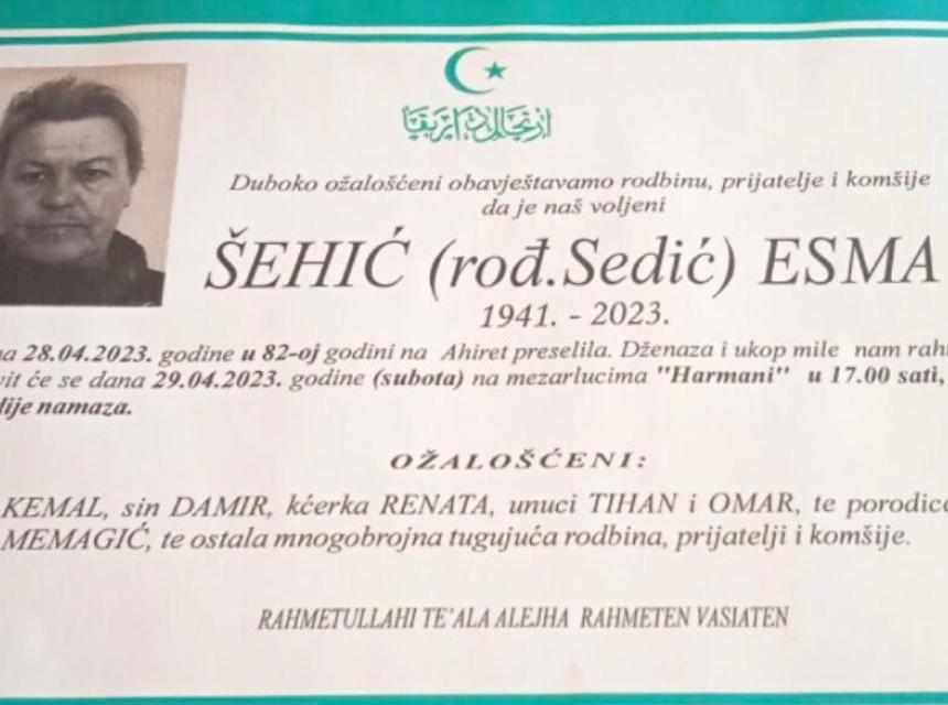 Tužnim srcem i bolom u duši javljamo rodbini, prijateljima i komšijama da je naša draga Šehić (rođ. Sedić) Esma, dana 28.04.2023. godine u 82-oj godini života, preselila na Ahiret.