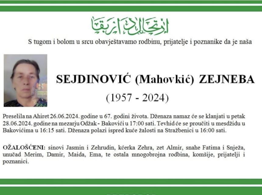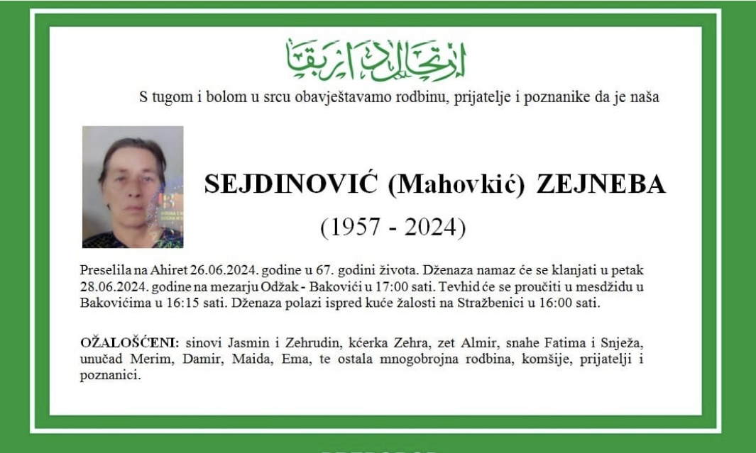 Tužnim srcem i bolom u duši javljamo rodbini, prijateljima i komšijama da je naša draga Sejdinović (Mahovkić) Zejneba, dana 26.06.2024. godine u 67-oj godini života, preselila na Ahiret.