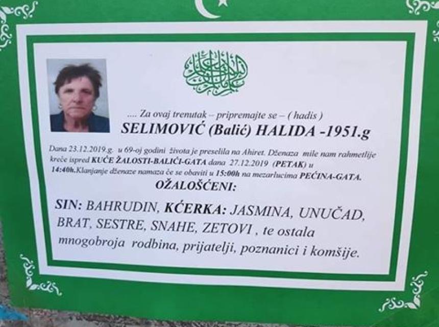 Selimović (Balić) Halida dana 23.12.2019.g. u 69-oj godini života je preselila na Ahiret. Dženaza mile rahmetlije kreće ispred kuće žalosti Baltići Gata dana 27.12.2019 (petak) u 14:40h. Klanjanje dženaze namaza će se obaviti u 15:00h na mezarlucima Pećina Gata.