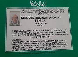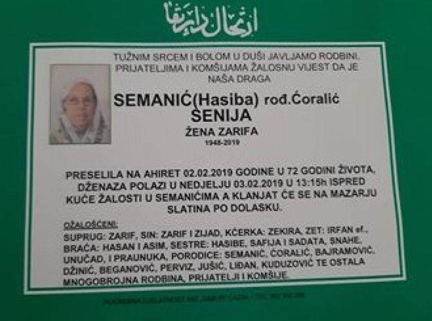 Javljamo rodbini, prijateljima i poznanicima da je dana 02.02.2019.g. u 72-oj godini života na Ahiret preselila Semanić (Hasiba) rođ. Ćoralić Senija.