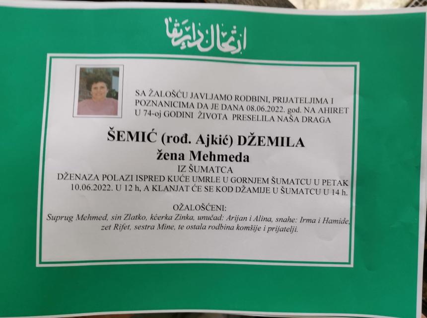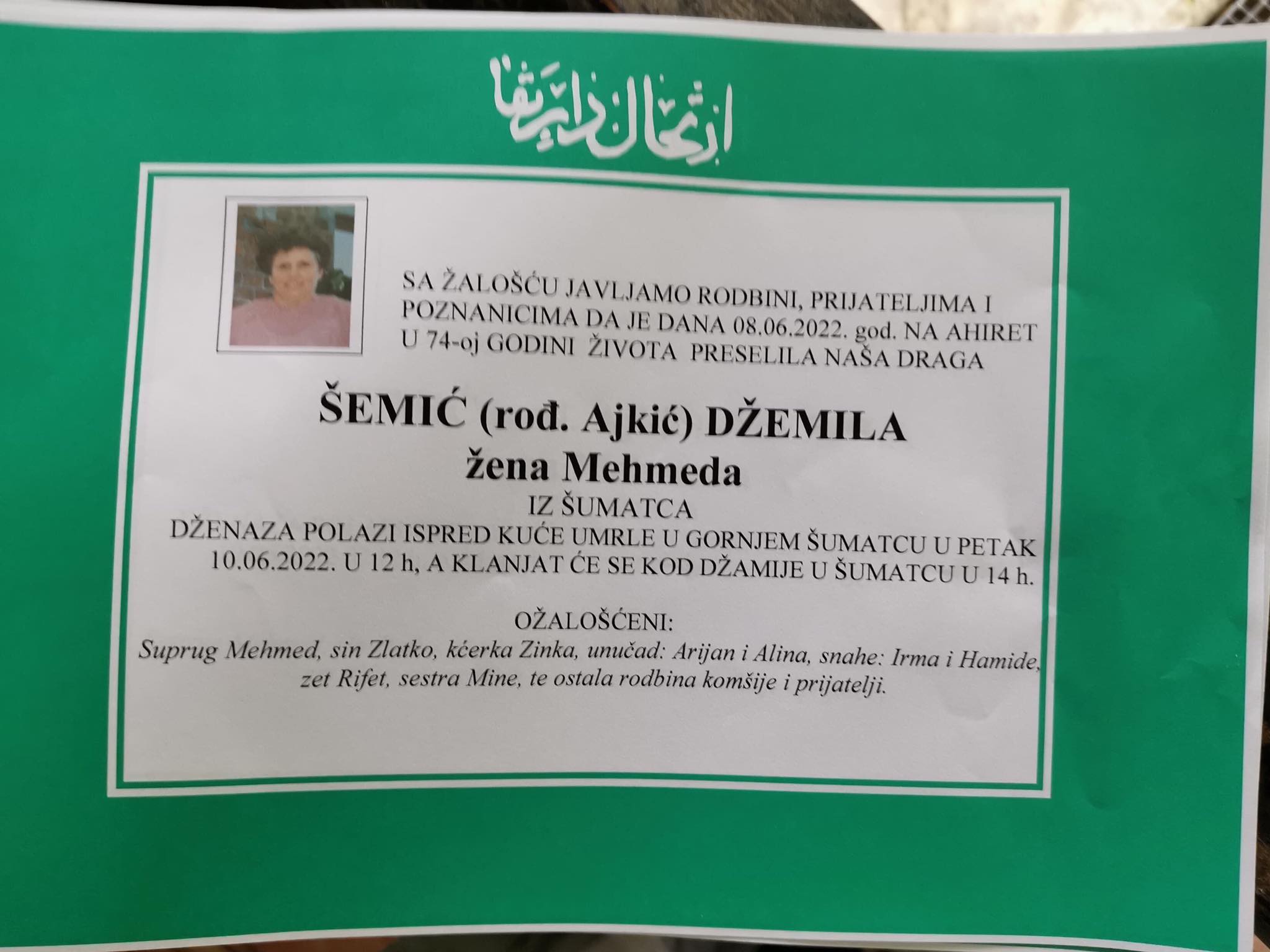 Tužnog srca i s bolom u duši obavještavamo rodbinu, komšije i prijatelje da je naša draga Šemić (rođ. Ajkić) Džemila - žena Mehmeda u 74. godini života preselila na Ahiret.