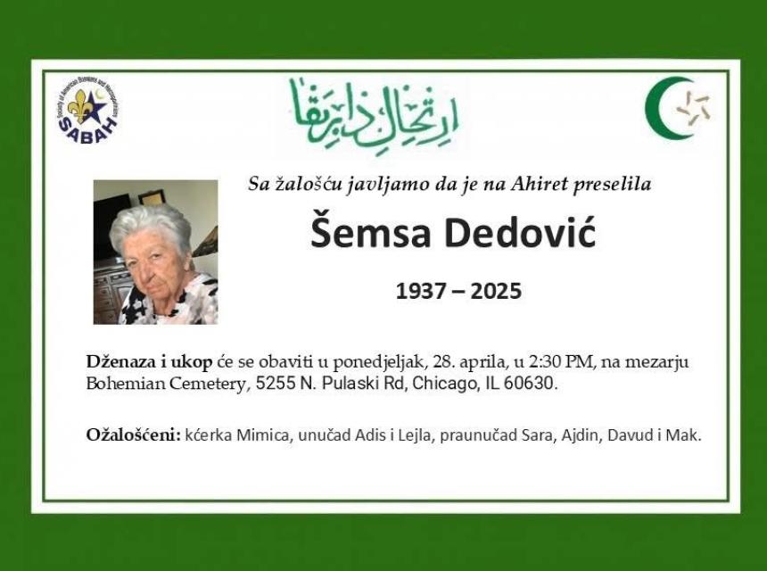 Dženaza i ukop će se obaviti u ponedjeljak 28..04.2025. godine u 2:30 PM, na mezarju Bohemian Cemetery, 5255 N. Pulaski Rd, Chicago, IL 60630.
