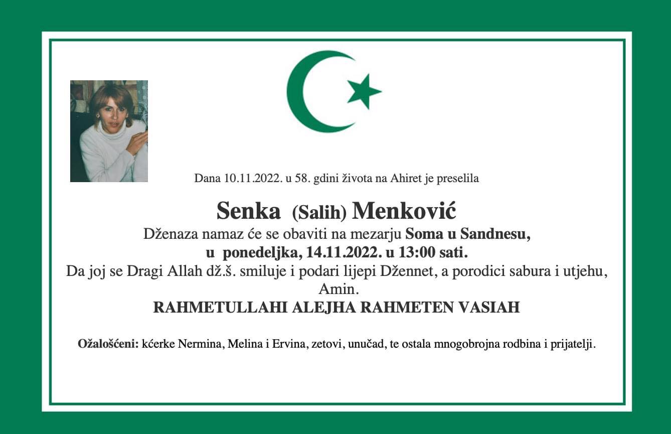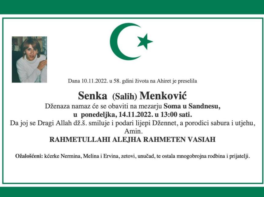 Tužnim srcem i bolom u duši javljamo rodbini, prijateljima i komšijama da je dana 10.11.2022. godine na Ahiret preselila Senka (Salih) Menković.