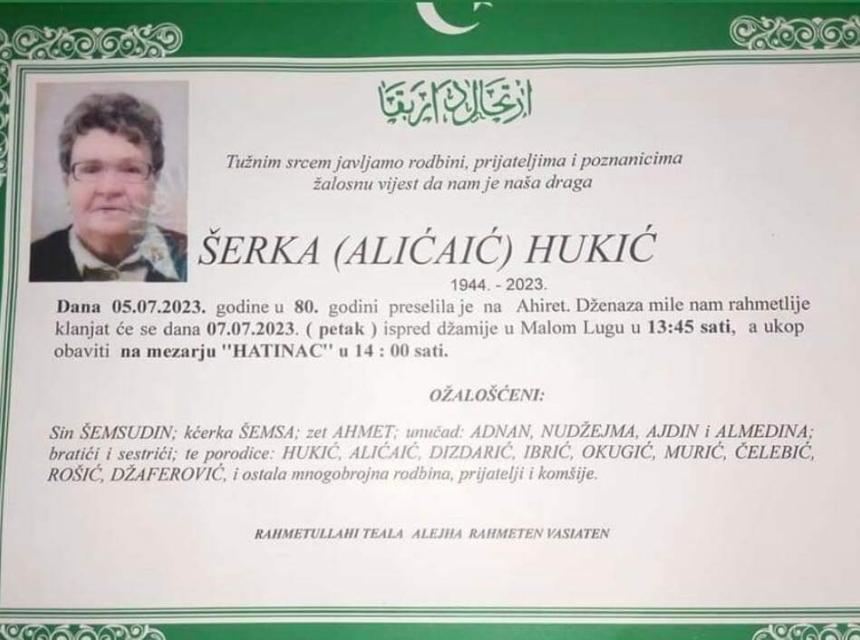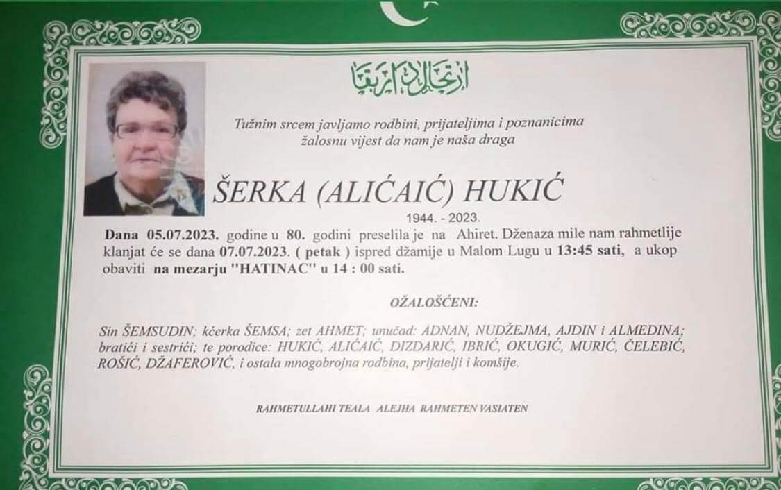 Tužnim srcem i bolom u duši javljamo rodbini, prijateljima i komšijama da je naša draga Šerka (Alićaić) Hukić, dana 05.07.2023. godine u 80-oj godini života, preselila na Ahiret.