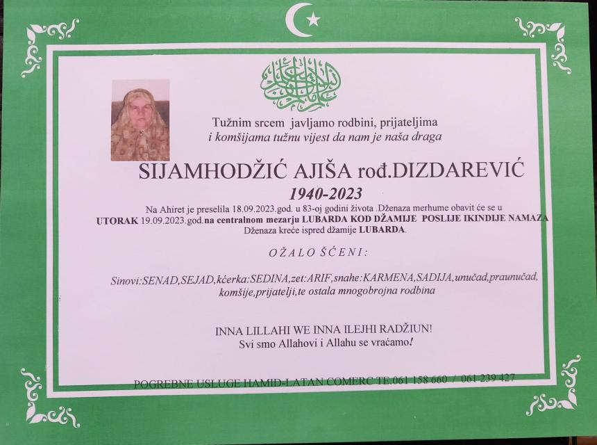 Tužnim srcem i bolom u duši javljamo rodbini, prijateljima i komšijama da je naša draga Sijamhodžić Ajiša rođ. Dizdarević, dana 18.09.2023. godine u 83-oj godini života, preselila na Ahiret.