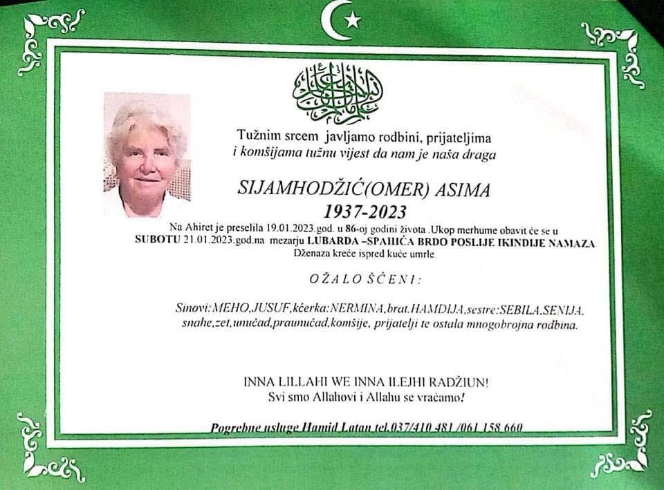 Obavještavamo rodbinu, komšije i prijatelje da je dana 19.01.2023.godine , u 86-oj godini života, na Ahiret preselila Sijamhodžić (Omer) Asima.