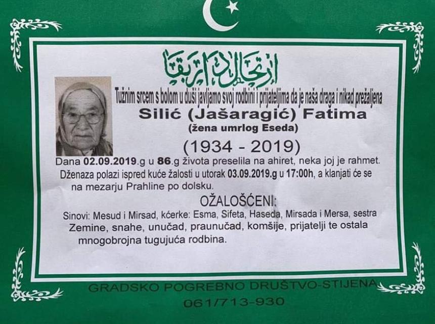 Tužnim srcem i bolom u duši javljamo rodbini, prijateljima,komšijama i poznanicima da je dana 02.09.2019.godine u 86.-oj godini života na Ahiret preselila naša draga Silić (Jašaragić) Fatima.