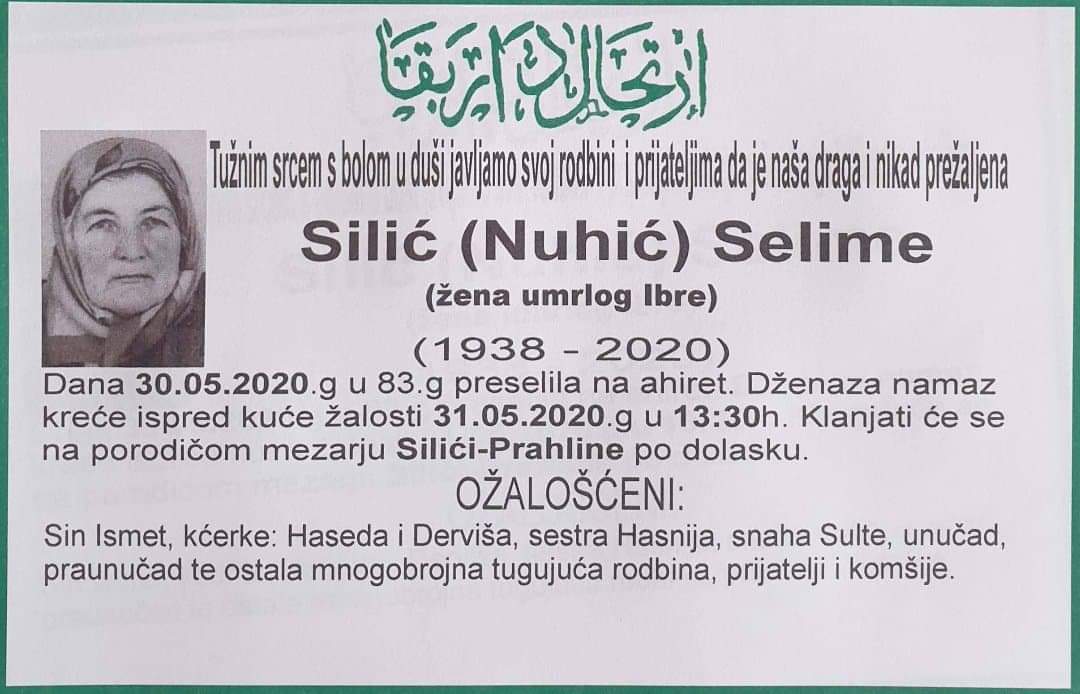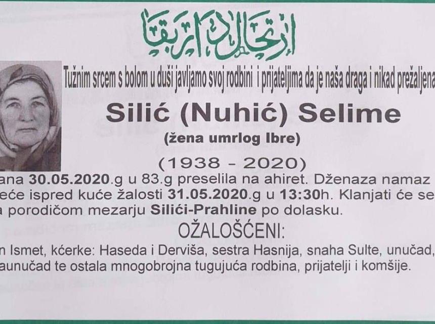 Tužnim srcem i bolom u duši javljamo rodbini i prijateljima da je naša draga i nikad prežaljena Silić (Nuhić) Selime dana 30.05.2020. godine u 83-oj godini života preselila na Ahiret.