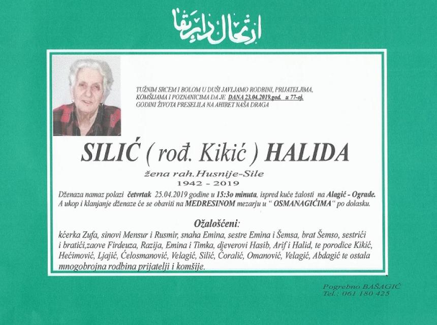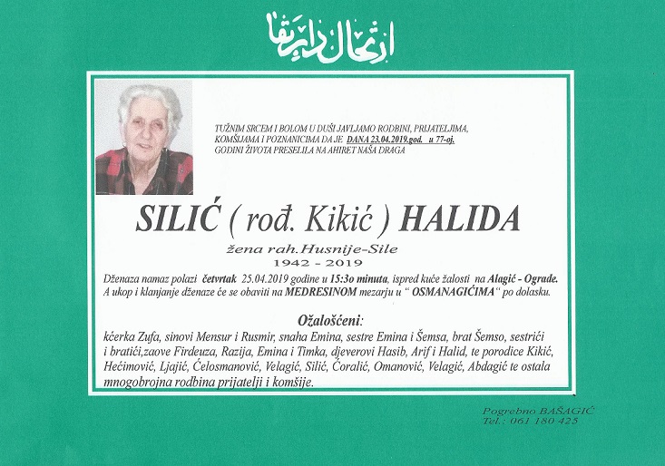 Tužnim srcem i bolom u duši javljamo rodbini, prijateljima, komšijama i poznanicima da je dana 23.04.2019. godine u 77. godini života na Ahiret preselila naša draga Silić (rođ. Kikić) Halida.