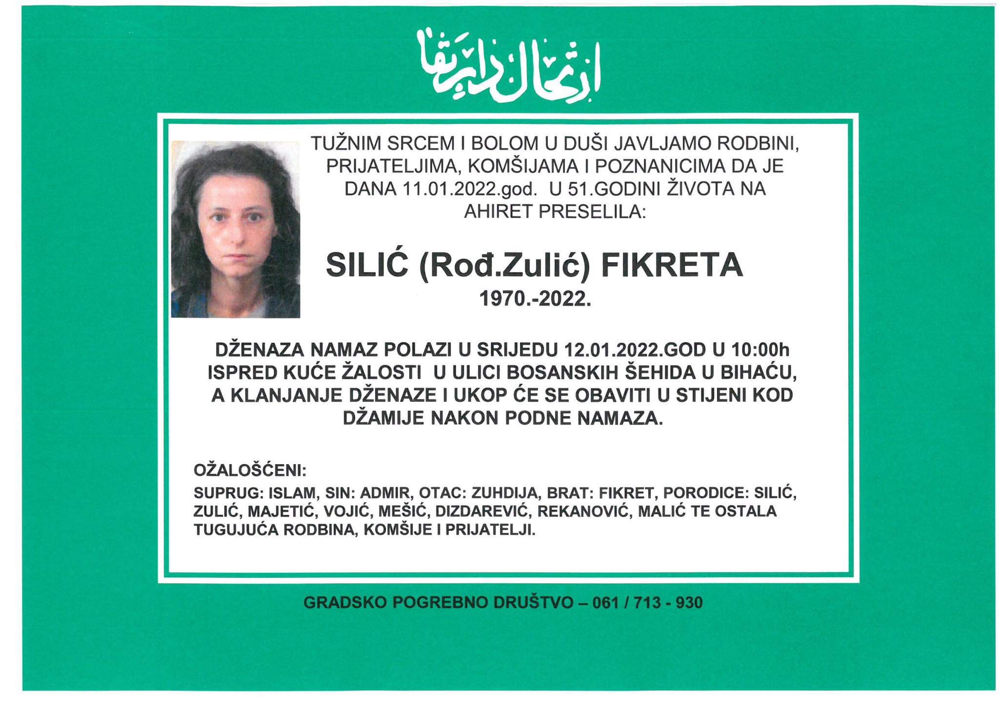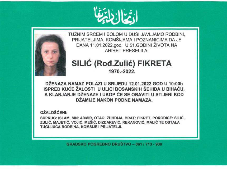 Tužnog srca i s bolom u duši obavještavamo rodbinu, komšije i prijatelje da je naša draga Silić (rođ. Zulić) Fikreta u 51. godini života dana 11.1.2022. preselila na ahiret.
