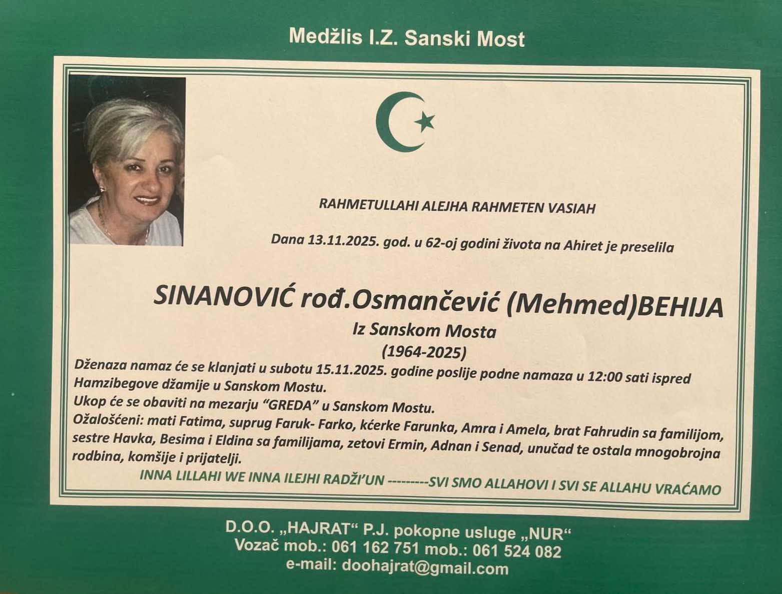 Dženaza namaz će se klanjati u subotu 15.11.2025. godine poslije podne namaza u 12:00 sati ispred Hamzibegove džamije u Sanskom Mostu.