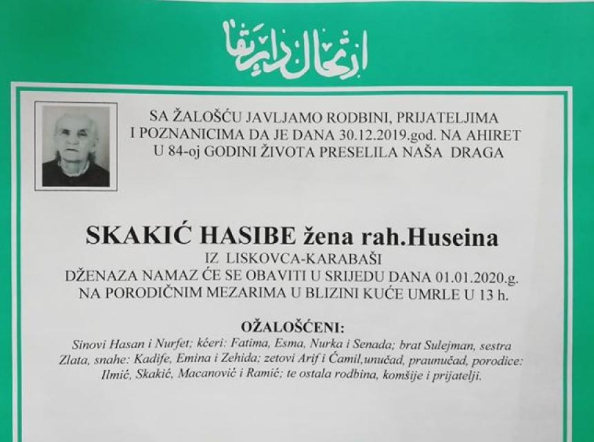 Tužnim srcem i bolom u duši javljamo rodbini i prijateljima da je dana 30.12.2019. godine u 84-oj godini života, na Ahiret preselila Skakić Hasibe žena rah. Huseina.