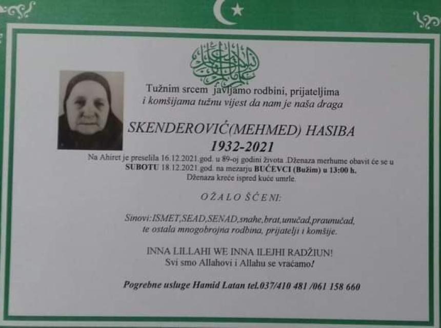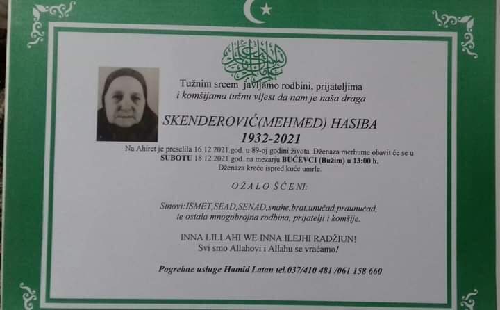 Tužnog srca i s bolom u duši obavještavamo rodbinu, komšije i prijatelje da je naša draga Skenderović (Mehmed) Hasiba dana 16.12.2021. u 89. godini života preselila na ahiret.