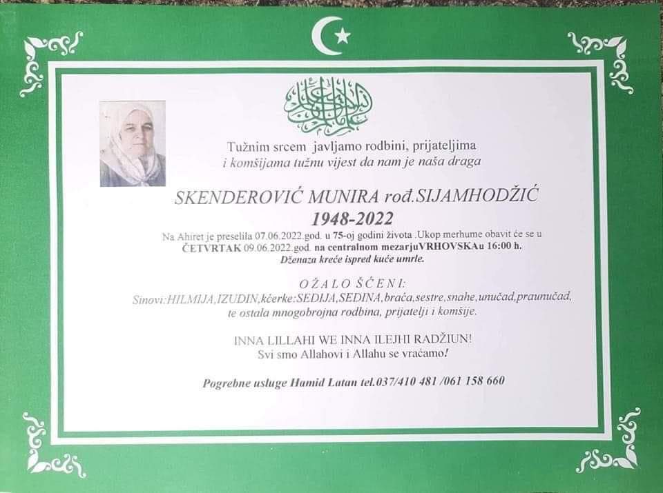 Tužnog srca i s bolom u duši obavještavamo rodbinu, komšije i prijatelje da je naša draga Skenderović Munira rođ. Sijamhodžić u 75. godini života preselila na Ahiret.