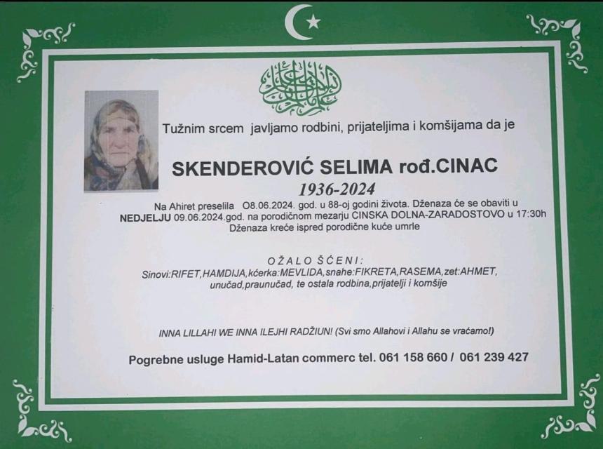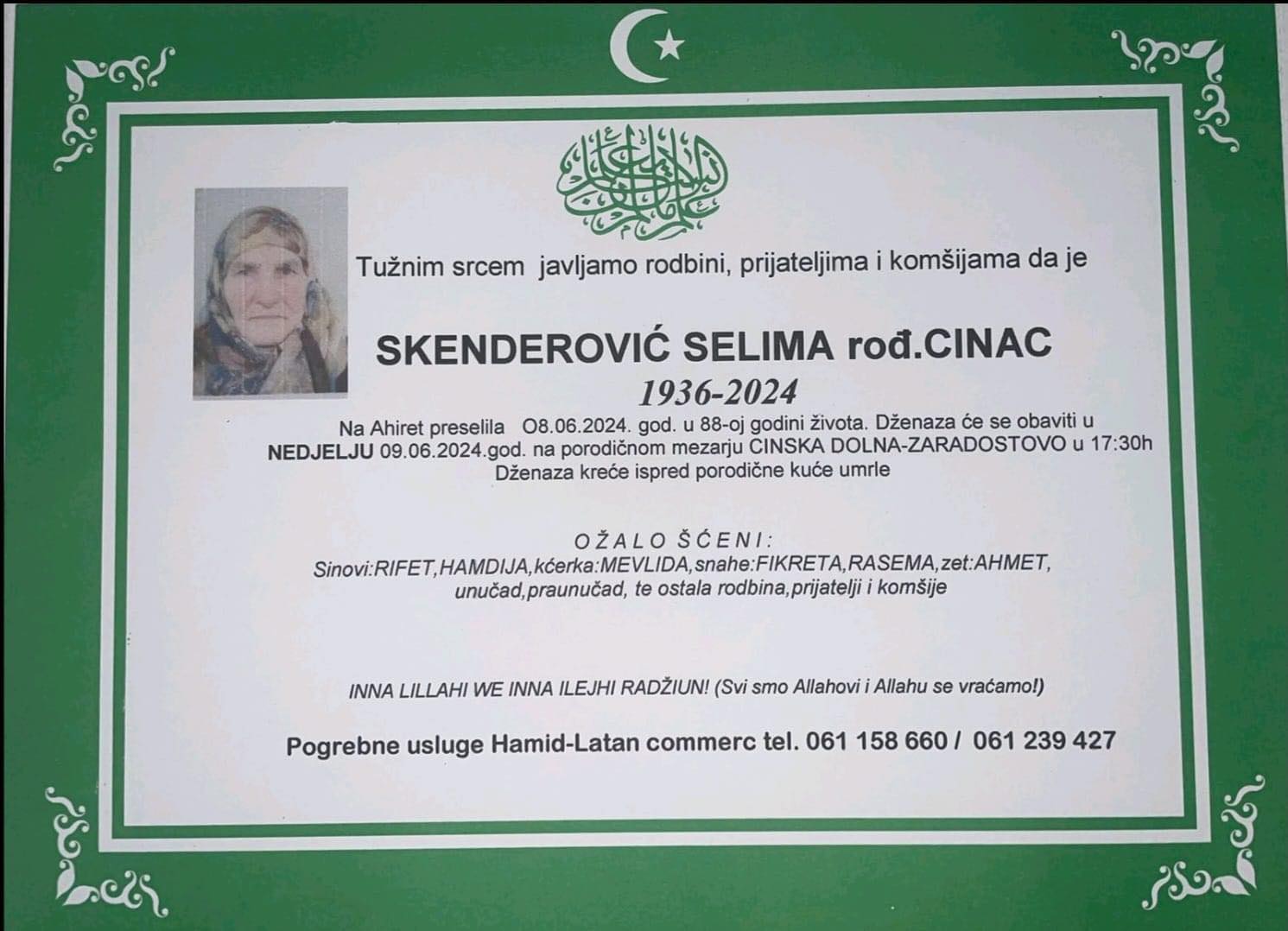 Tužnim srcem i bolom u duši javljamo rodbini, prijateljima i komšijama da je naša dragaSkenderović Selima rođ. Cinac, dana 08.06.2024. godine u 88-oj godini života, preselila na Ahiret.