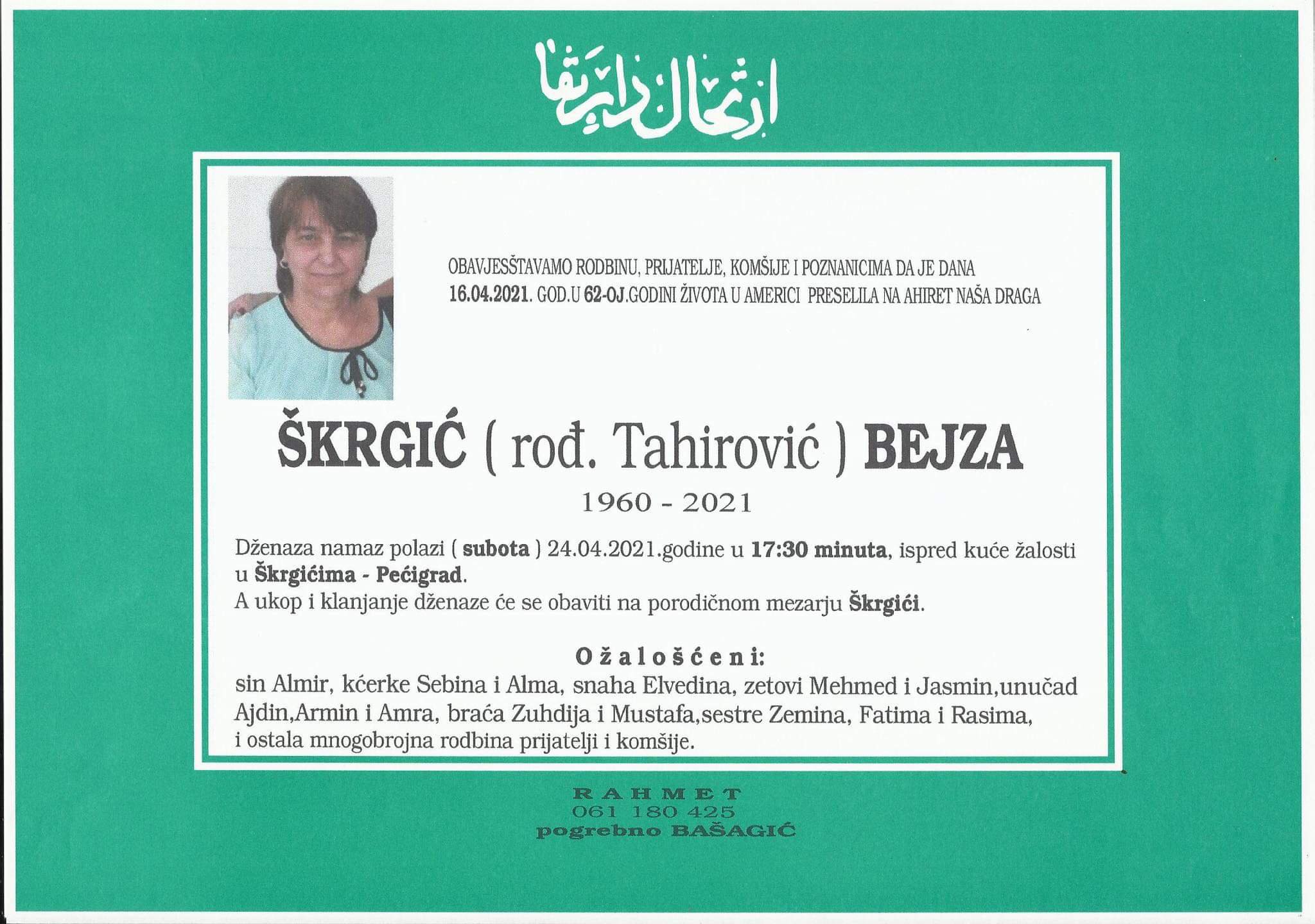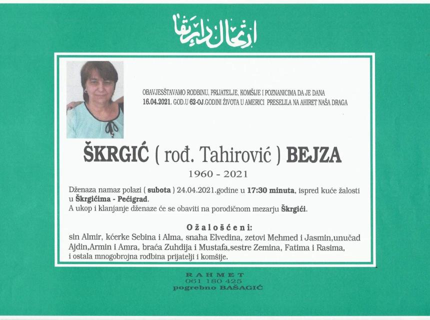 Tužnog srca i s bolom u duši obavještavamo rodbinu, komšije i prijatelje da je naša draga Škrgić (rođ. Tahirović) Bejza, dana 16.04.2021 godine, u 62-oj godini života, preselila na Ahiret.
