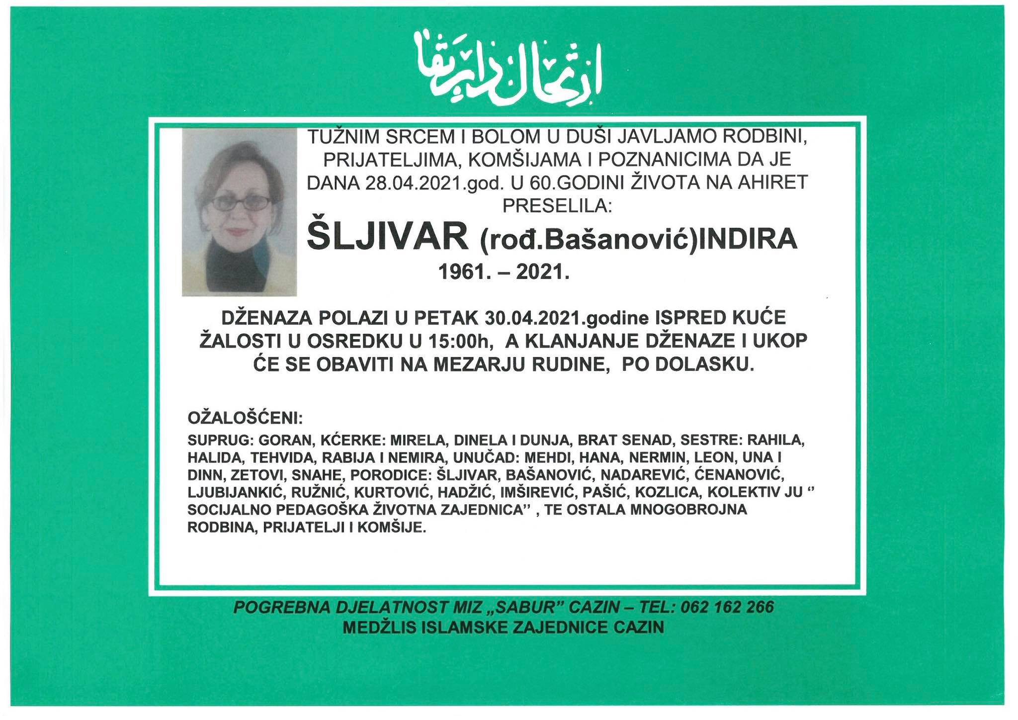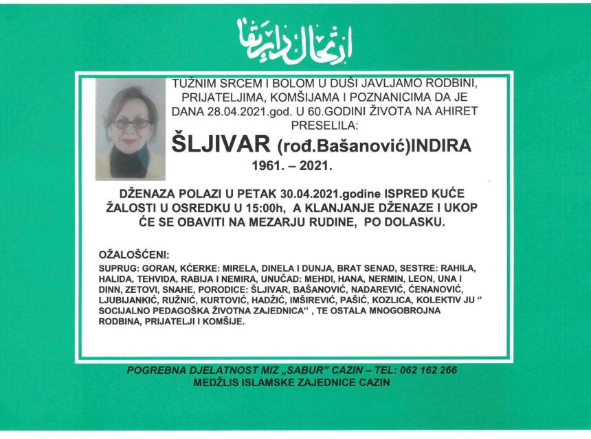 Tužnog srca i s bolom u duši obavještavamo rodbinu, komšije i prijatelje da je naša draga Šljivar (rođ. Bašanović) Indira, dana 28.04.2021 godine, u 60-oj godini života, preselila na Ahiret.