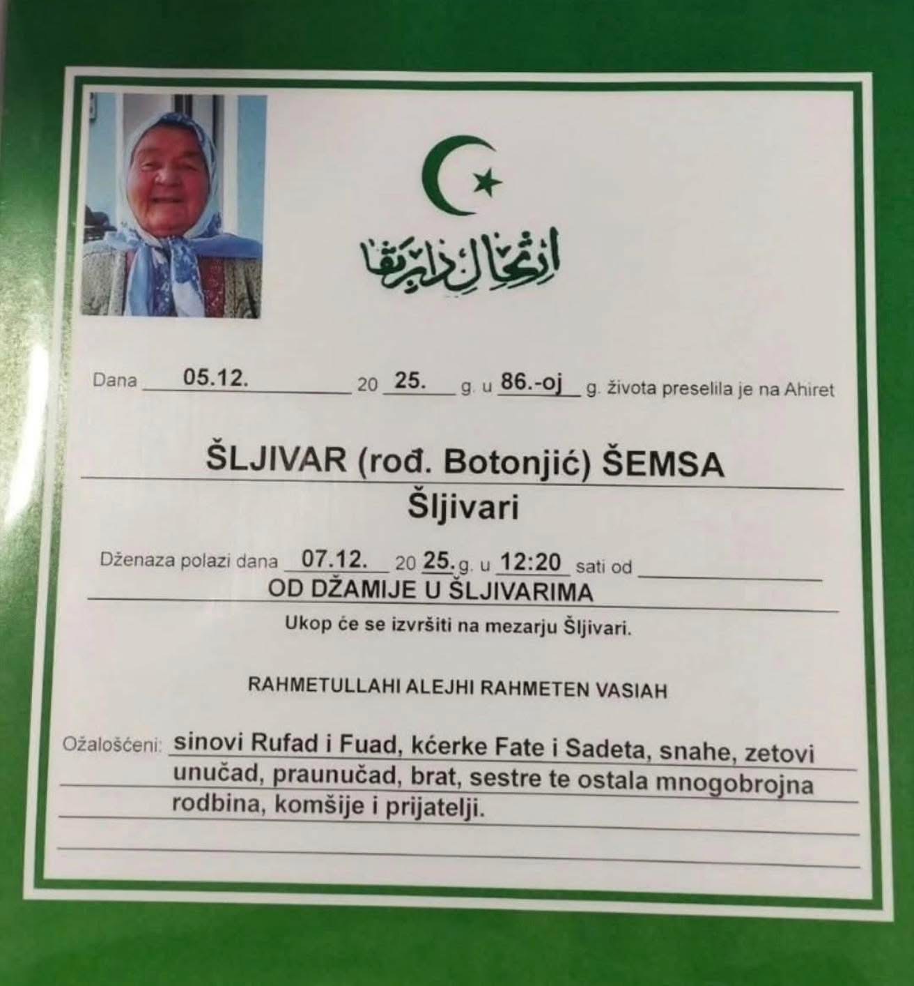 Dženaza polazi dana 07.12.2025. godine u 12:20 sati od džamije u Šljivarima.