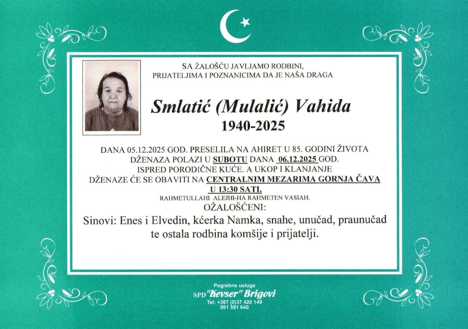 Dženaza polazi u subotu, 06.12.2025. godine, ispred porodične kuće, a ukop i klanjanje dženaze će se obaviti na Centralnim mezarima Gornja Čava u 13:30 sati.