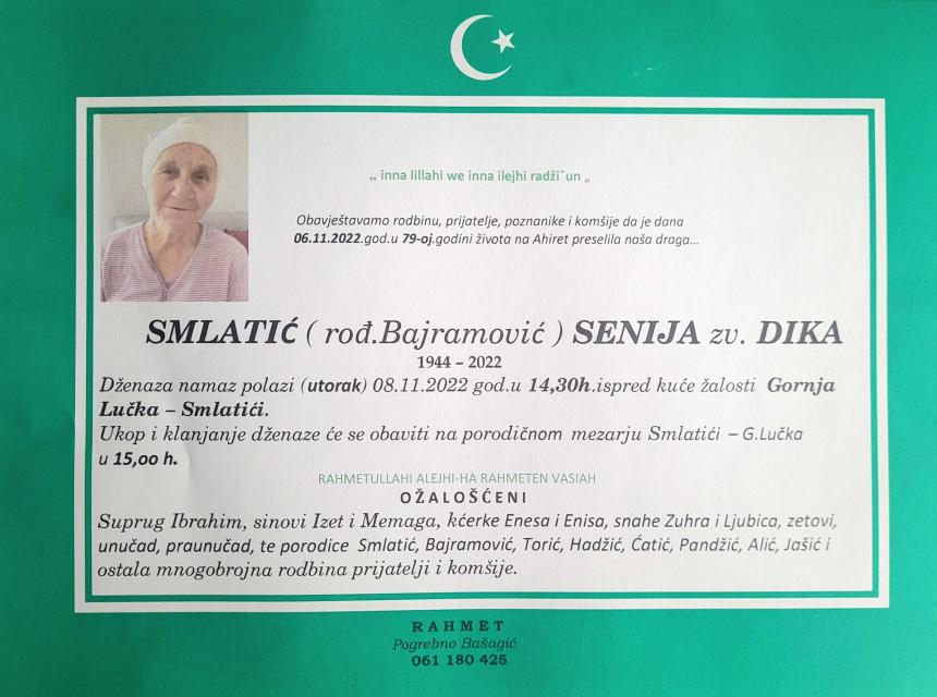Tužnim srcem i bolom u duši javljamo rodbini, prijateljima i komšijama da je dana 06.11.2022. god. u 79. godini života na Ahiret preselila Smlatić (rođ.Bajramović) Senija zv. Dika.