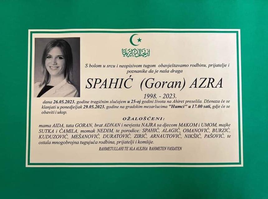 Tužnim srcem i bolom u duši javljamo rodbini, prijateljima i poznanicima da je naša draga Spahić (Goran) Azra, dana 26.05.2023. godine tragičnim slučajem u 25-oj godini života, preselila na Ahiret.