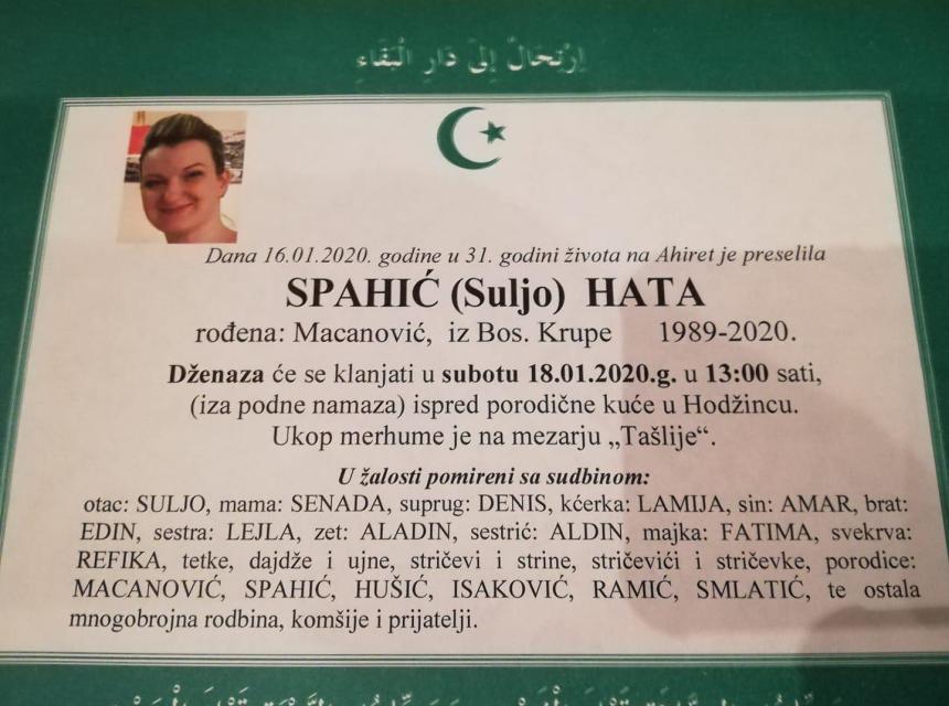 Tužnim srcem i bolom u duši javljamo rodbini i prijateljima da je naša draga i nikad prežaljena Spahić (Suljo) Hata, rođ. Macaljević, dana 16.01.2020. godine u 31. godini života preselila na Ahiret.